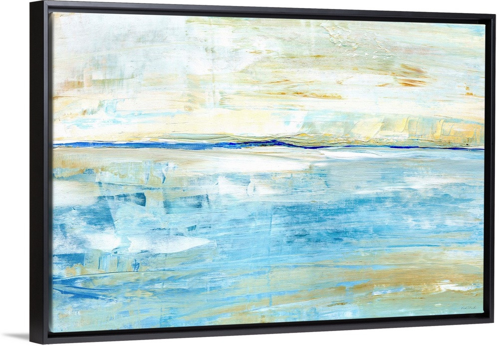 <p>Horizontal abstract painting of a seascape horizon in shades of blue and beige.</p>