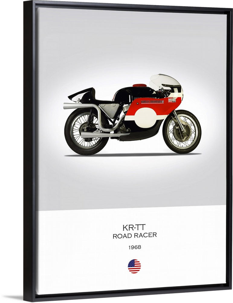 <p>Photograph of a HD KR TT Road Racer 1968 printed on a white and gray background.</p>