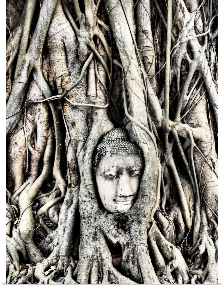<p>The head of the sandstone buddha image in roots of bodhi tree in Ayutthaya,Thailand.</p>