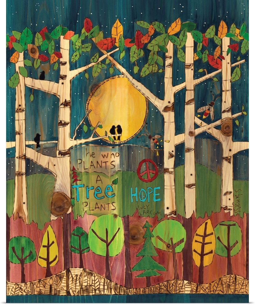 <p>Trees and birds with saying under a night sky.</p>