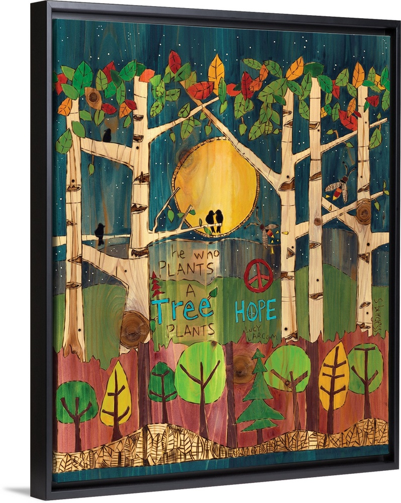 <p>Trees and birds with saying under a night sky.</p>