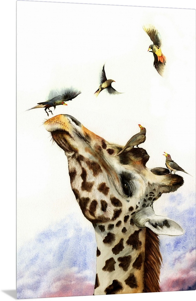 <p>A watercolour painting of a giraffe being pestered by ox-peckers</p>