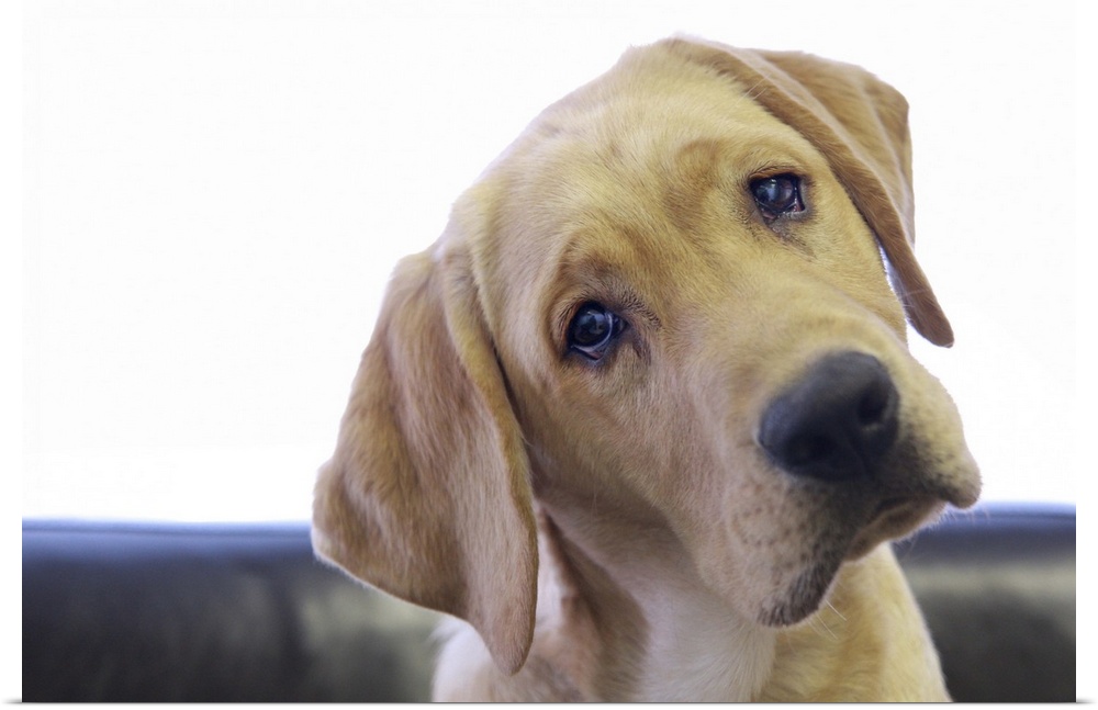 <p>Head of a labrador retriever puppy with watery eyes sitting on a leather chair in front of an overexposed window Calgary, Alberta</p>