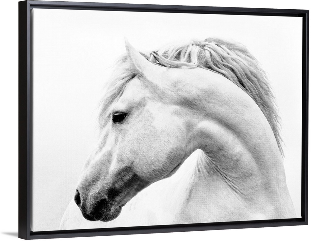<p>Black and white photograph of a white stallion with a flowing mane against a white background.</p>