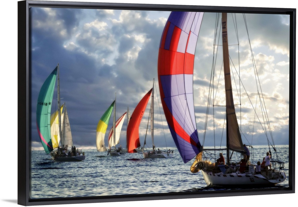 <p>Several sailboats with colorful sails under a cloudy sky in the evening.</p>