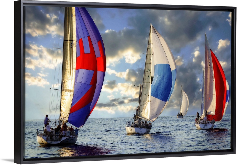 <p>A regatta of colorful sailboats with a cloudy sky.</p>