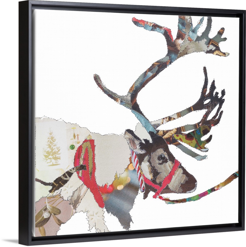 <p>Square artwork of a reindeer in a collage style outlined in stitches.</p>