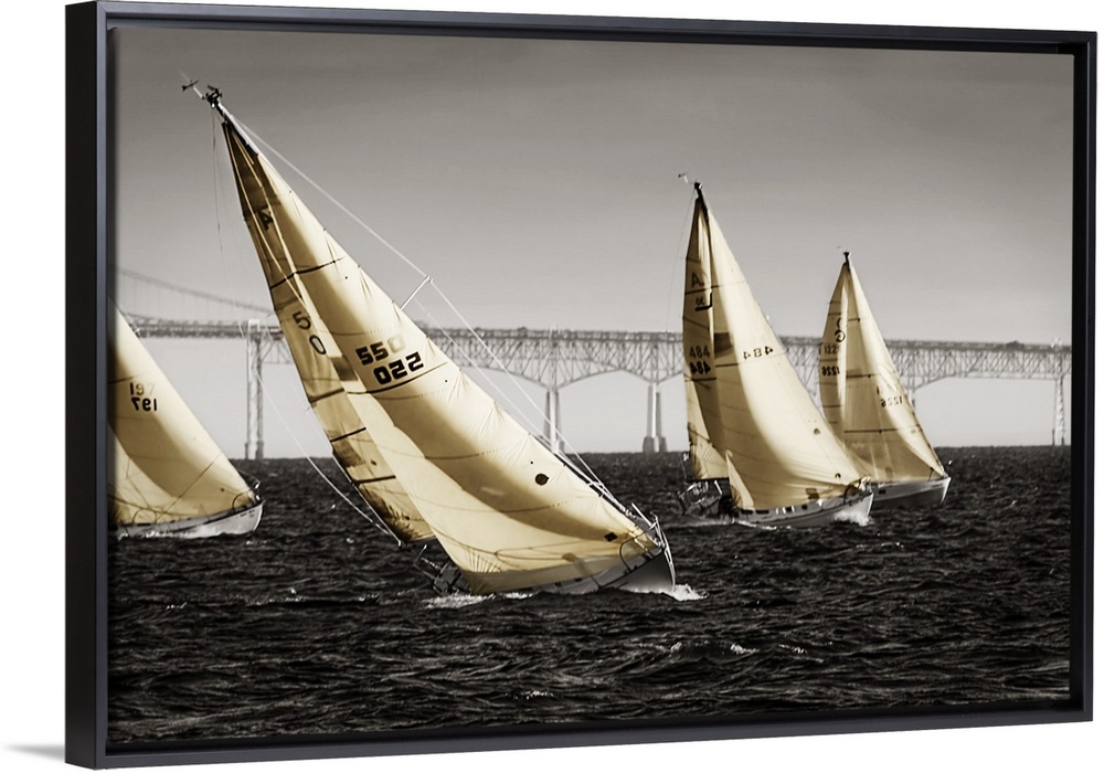<p>A group of sailboats on the water in Chesapeake Bay near a bridge.</p>
