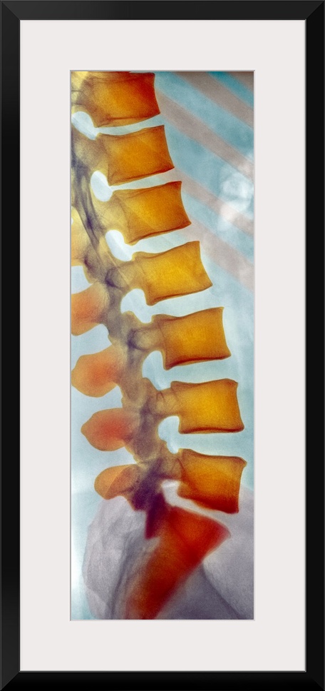<p>Healthy spine. Coloured X-ray of a side view of the healthy lower (lumbar) spine of an adult man. The front of the body is at right. The spinal column is made up of vertebrae (orange), block- like bones that protect the spinal cord and support the upper body. The projections at left are the attachment sites of muscles in the back. The spaces between the blocks of the vertebrae hold intervertebral discs (not seen), which cushion the spine against shock and allow a degree of flexibility. This part of the spine is subject to lower back pain. Rib bones are seen at top right.</p>