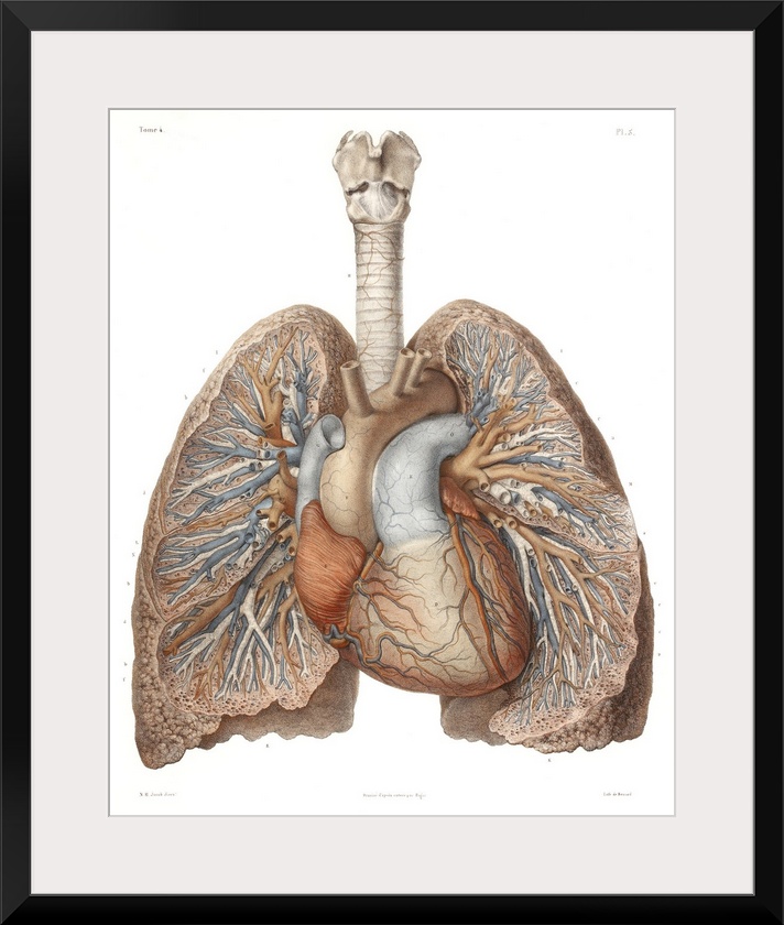 <p>Heart and lungs, historical illustration. 19th Century hand coloured lithographic print showing the lungs (left and right) situated either side of the heart (lower centre), aorta (red tube centre), pulmonary artery (blue, centre right) and vena cava (blue, centre left). Inside the lungs are the bronchioles (white tubes). The trachea (wind pipe, white) can be seen running down from the larynx (voicebox, top centre) in the neck. Image from 'Traite complet de l'anatomie de l'homme, comprenant la medecine operatoire' Vol. 4 (1836), by Jean-Baptiste Marc Bourgery and illustrated by Nicolas-Henri Jacob.</p>