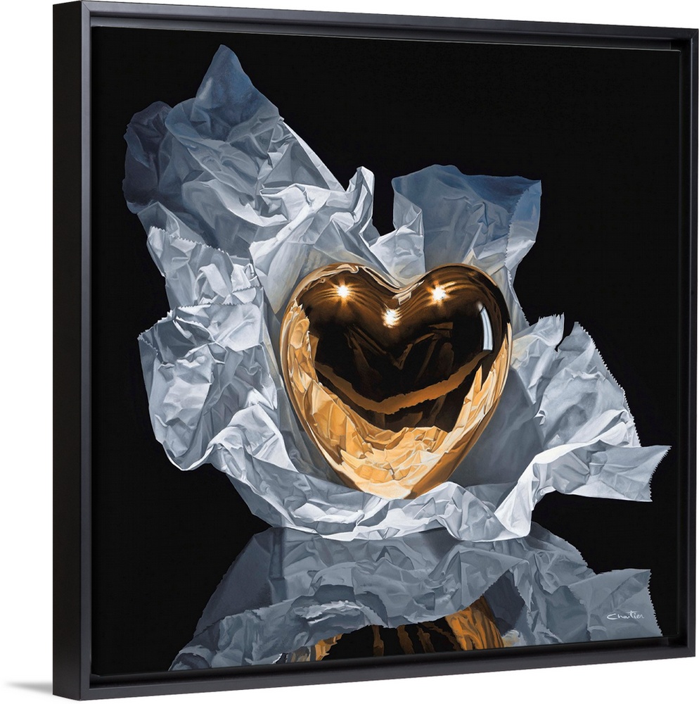 <p>Contemporary vivid realistic still-life painting of a golden reflective heart heart figurine sitting on crumpled and wrinkled tissue paper.</p>