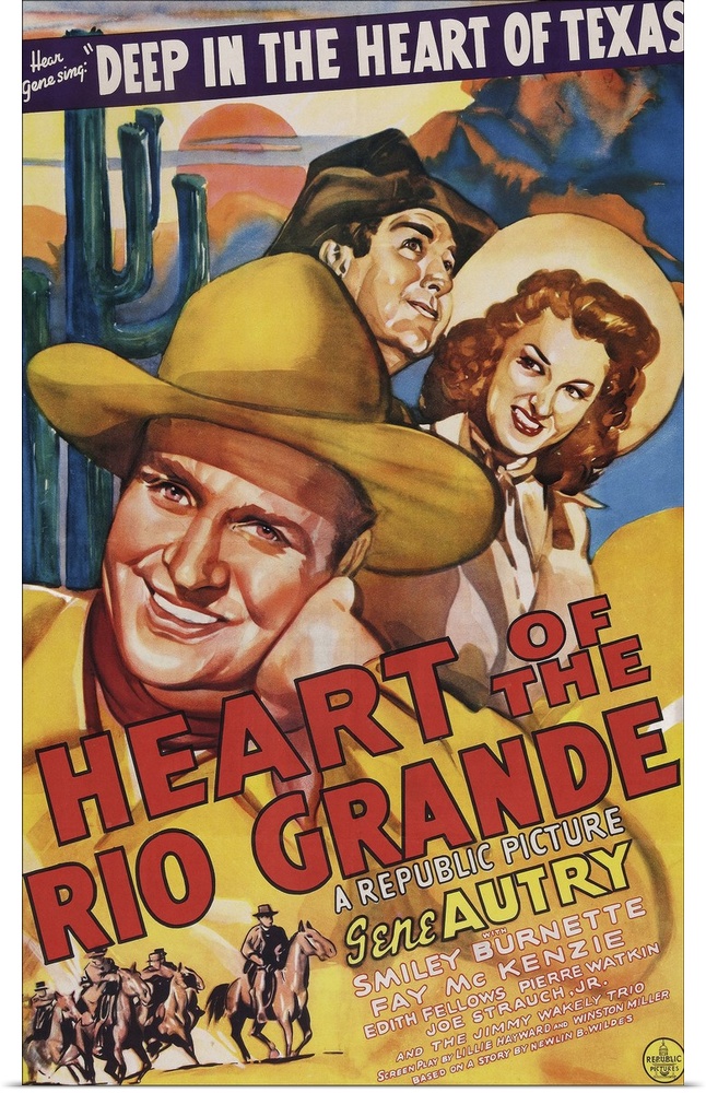 <p>HEART OF THE RIO GRANDE, US poster art, from left: Gene Autry, Smiley Burnette, Fay McKenzie, 1942</p>