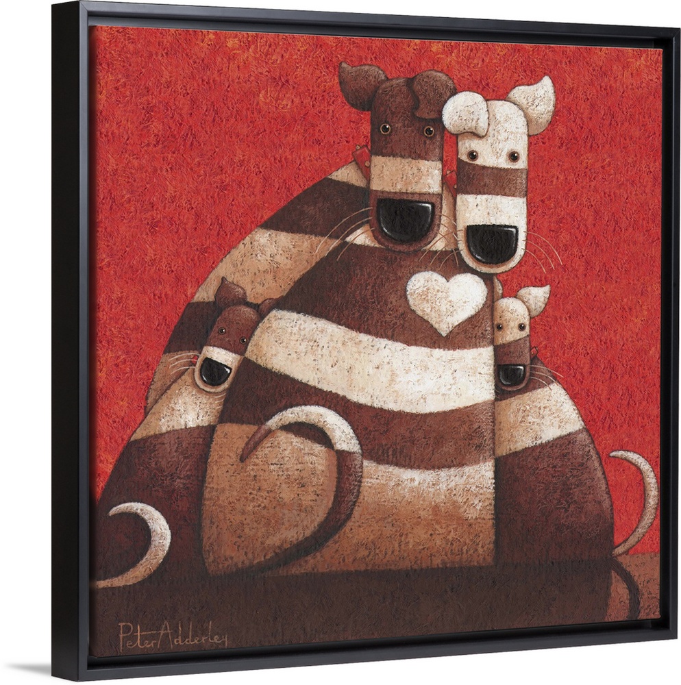 <p>Contemporary painting of striped dogs huddling together against a red background.</p>