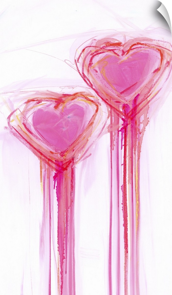 <p>Contemporary painting of two bright pink heart shapes with long streaks of dripping paint.</p>