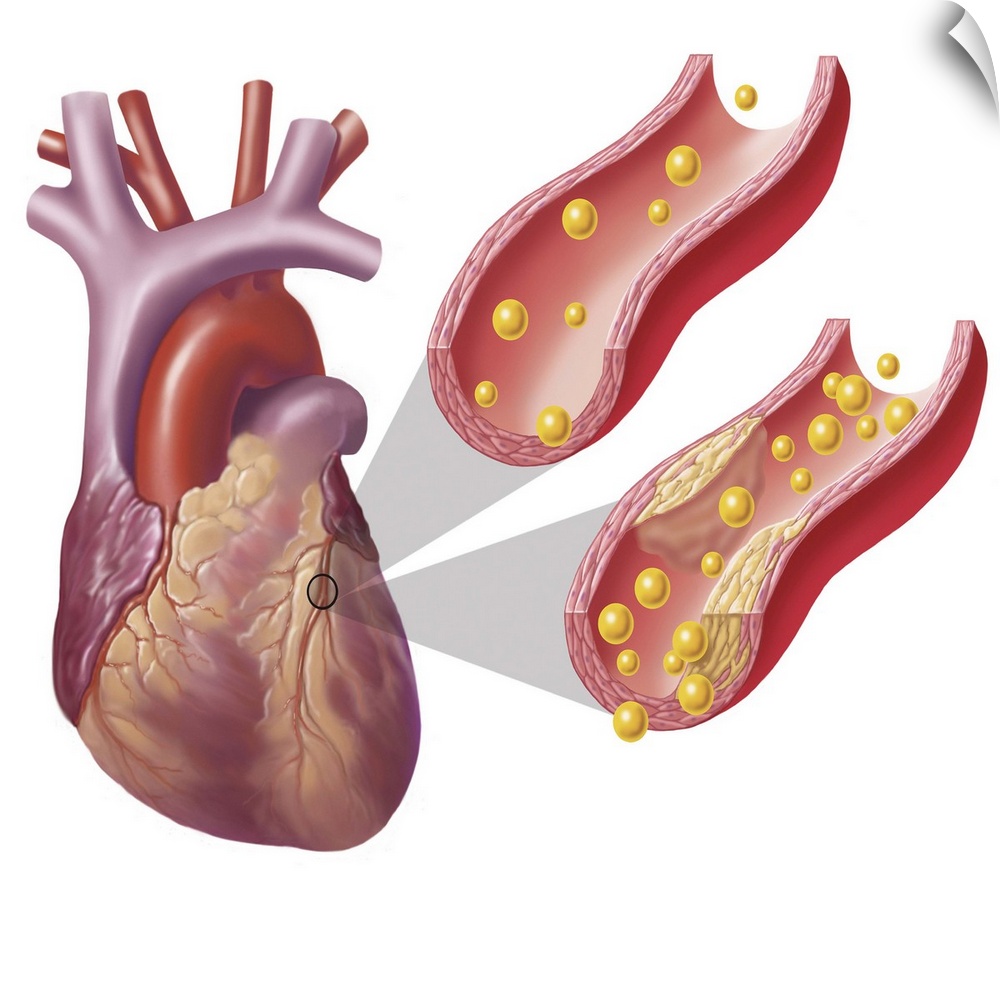 <p>Heart with arteries showing cholesterol in one artery and atherosclerotic plaque in the other.</p>