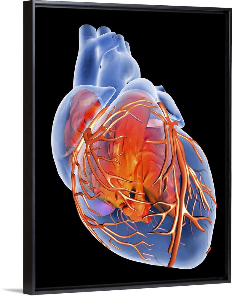 <p>Computer artwork of the heart indicating the coronary vessels and heart chambers.</p>