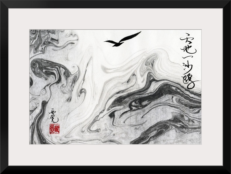 <p>This is inspired by the ancient poem from the Tang Dynasty by Du Fu with the phrases "What am I like here and there wandering, one lone gull between heaven and earth hovering" This is part of my Flow series. Heaven and earth is created with free flowing ink on water. The Chinese characters on the top right are heaven and earth and one lone sand gull</p>