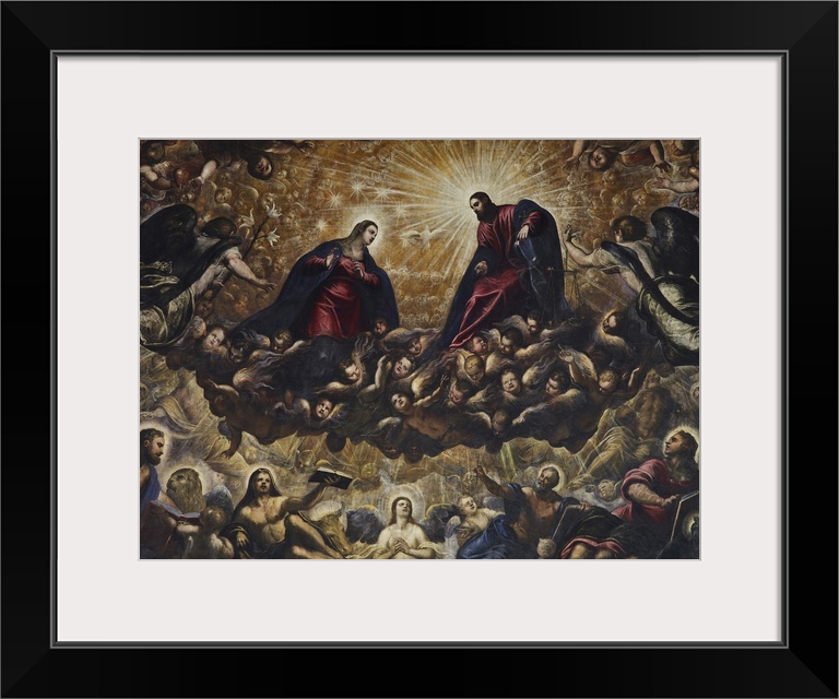 <p>Heaven, by Jacopo Robusti known as Tintoretto, 1588 - 1592 about, 16th Century, oil on canvas, cm 700 x 2200 - Italy, Veneto, Venice, Doges Palace. Detail. Madonna Virgin Mary and Jesus Christ, light halos aureoles array of angels seraphim cherubs blesse</p>