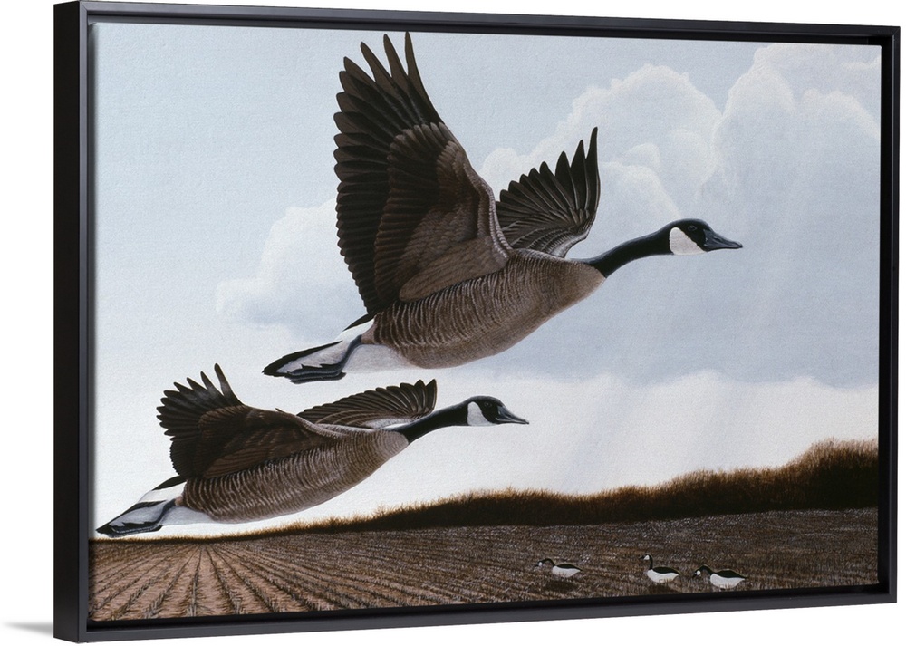 <p>Two canada geese taking off from a field.</p>