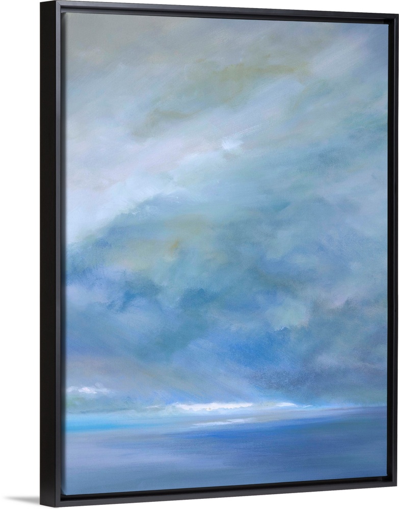 <p>Contemporary painting of a seascape with soft light streaming through the clouds.</p>