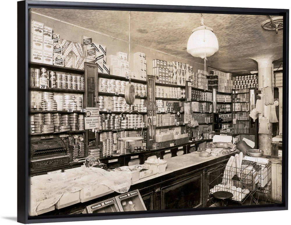 <p>Heavily stocked grocery store in the 1920's. Photograph</p>