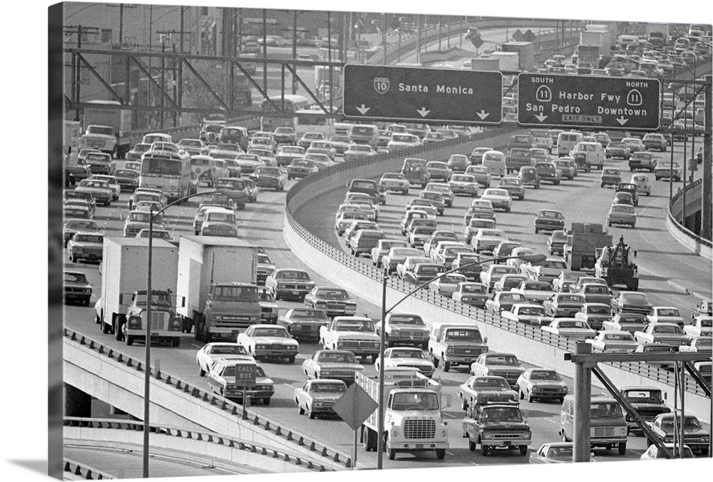 <p>6/20/73-Los Angeles, CA: Heavy afternoon traffic on the Santa Monica Freeway. The line of traffic at left is moving east from downtown Los Angeles. It's estimated that there are some 6,000,000 autos in the LA basin and LA County officials say that 90 of the area's serious air pollution now comes from the automobile. The Federal Government's Environmental Protection Agency approved June 15 a plan that would involve gas rationing for Los Angeles. BPA2</p>