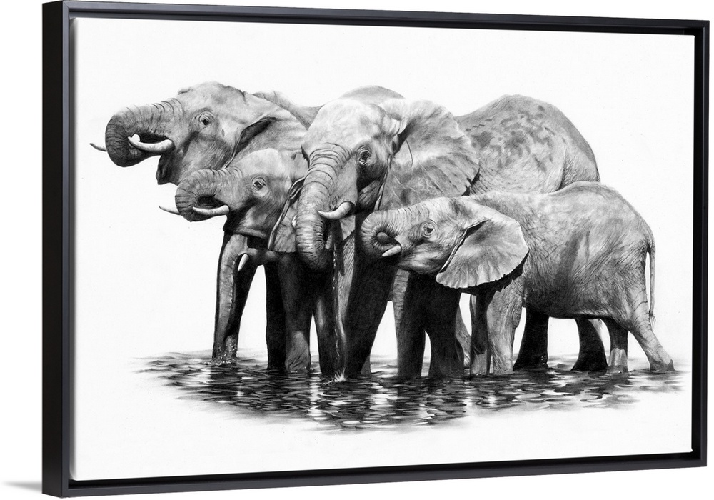 <p>A pencil drawing of a group of elephants taking a drink.</p>