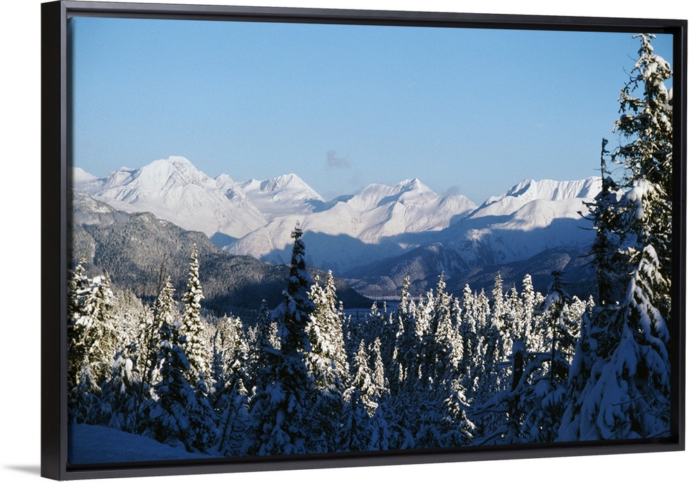 <p>Giant, horizontal, high angle photograph of snow covered pine trees near the Chugach Mountains in Alaska.</p>