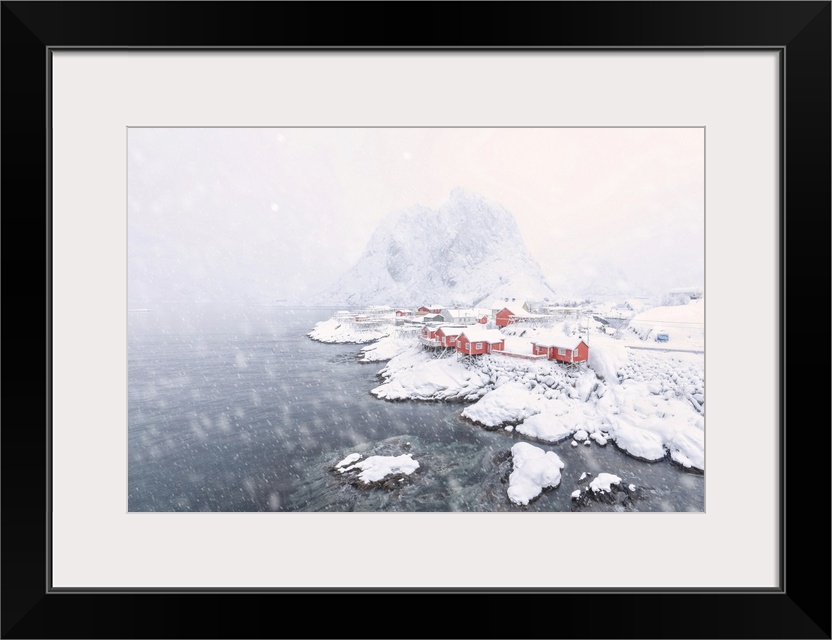 <p>Heavy snowfall on the fishermen's houses called Rorbu surrounded by the frozen sea, Hamnoy, Lofoten Islands, Arctic, Norway, Scandinavia, Europe</p>