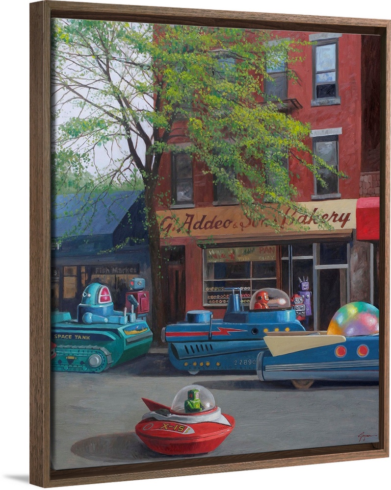 <p>A contemporary painting of a street scene in a city with retro toy robots driving spaceship vehicles.</p>
