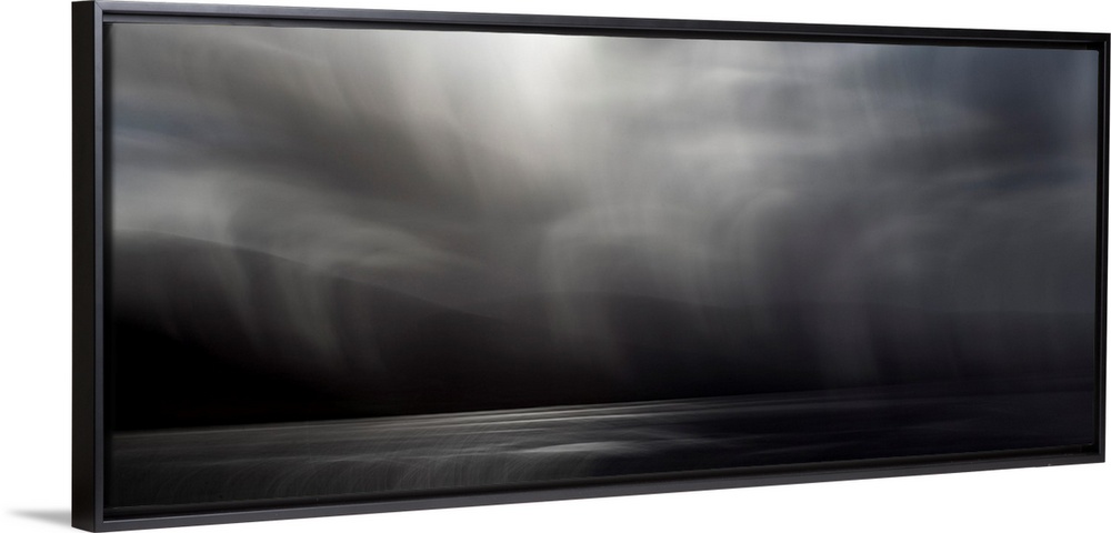 <p>A monochrome black and white impressionistic seascape from the Scottish Island of Harris and Lewis wisth falling soft rain and silvery light over the hills and sea.</p>