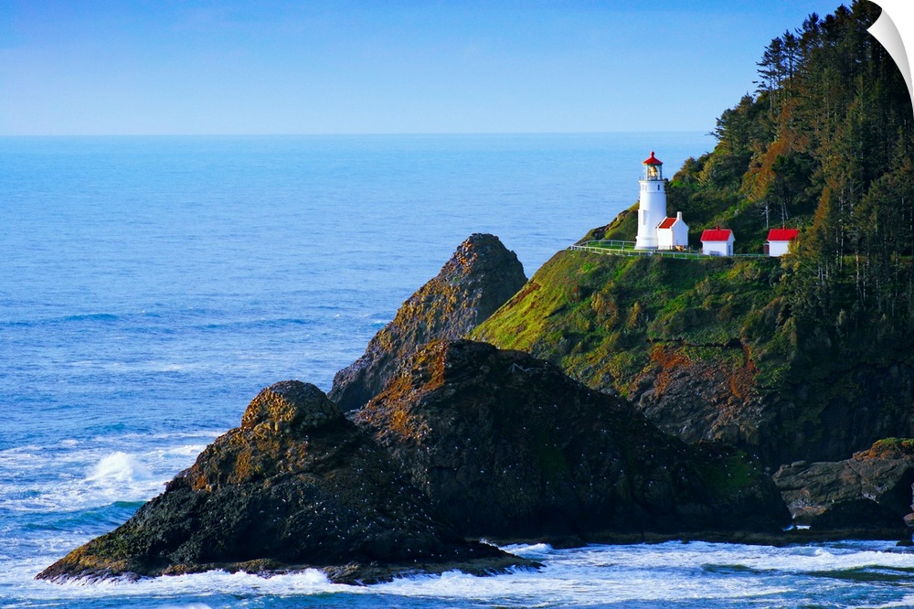 <p>A lighthouse stands on the edge of a cliff that is surrounded by large rock formations in the Pacific ocean.</p>