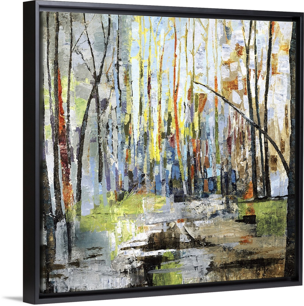 <p>Square abstract landscape with colorful bare trees in a forest setting, reaching to the top of the canvas.</p>
