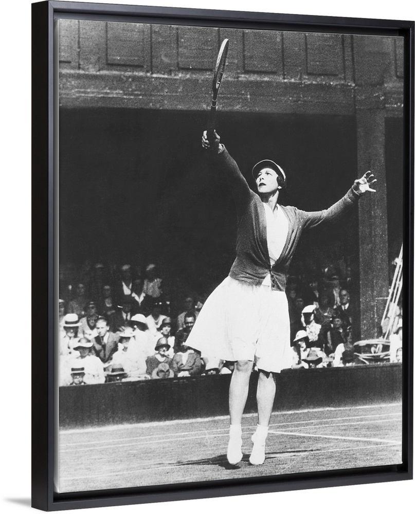 <p>Helen Wills Moody returning a high one during her match with Mrs. J.P. Macready of England. July 4, 1933. Wills Moody won the match , 6 0, 6 0, in the first round of the Women's Singles Championships at Wimbledon England.</p>