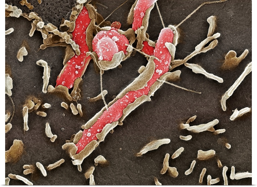 <p>Helicobacter pylori bacteria. Coloured scanning electron micrograph (SEM) of H. pylori bacteria (red) on the surface of a human gastric epithelial cell. H. pylori is a Gram-negative spiral-shaped bacterium found in the mucus lining of the stomach. It causes gastritis, and is also the most common cause of stomach ulcers. It may also be a cause or co-factor for gastric cancer as its presence increases the risk of developing stomach tumours.</p>