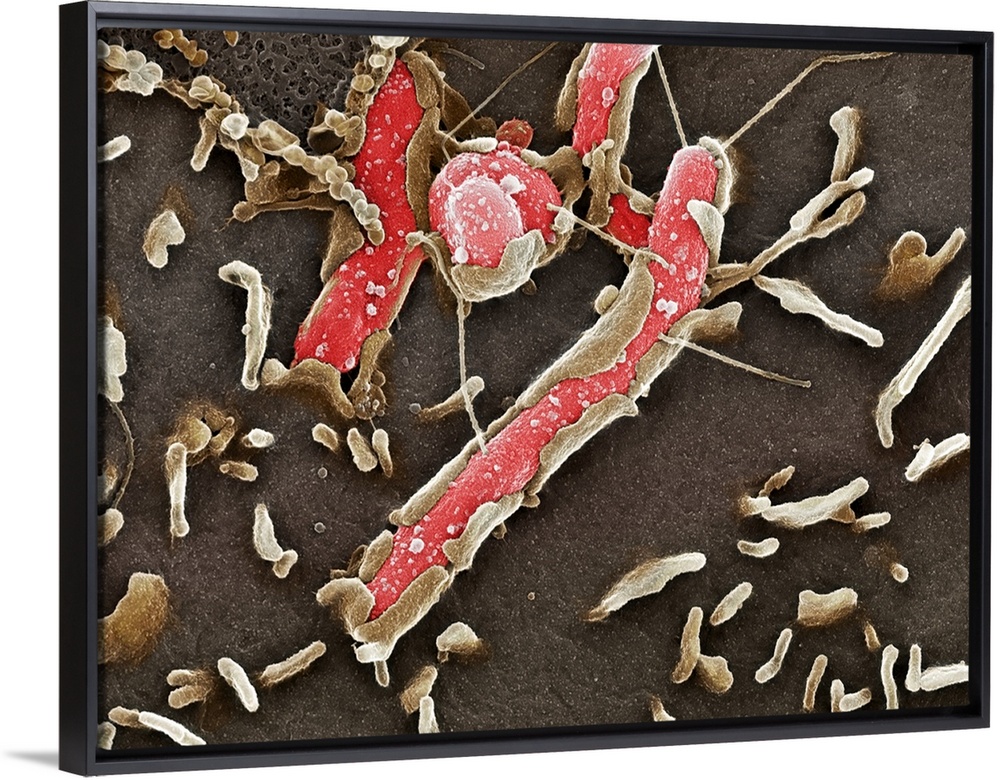 <p>Helicobacter pylori bacteria. Coloured scanning electron micrograph (SEM) of H. pylori bacteria (red) on the surface of a human gastric epithelial cell. H. pylori is a Gram-negative spiral-shaped bacterium found in the mucus lining of the stomach. It causes gastritis, and is also the most common cause of stomach ulcers. It may also be a cause or co-factor for gastric cancer as its presence increases the risk of developing stomach tumours.</p>