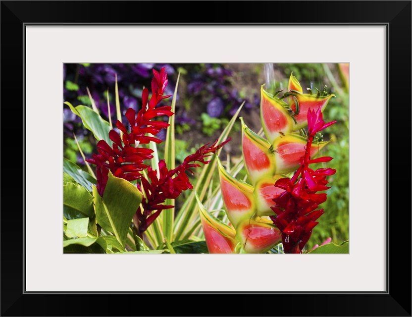 <p>Dominica, Roseau, tropical vegetation, heliconia, heliconiaceae, and red ginger, alpinia purpurata.</p>