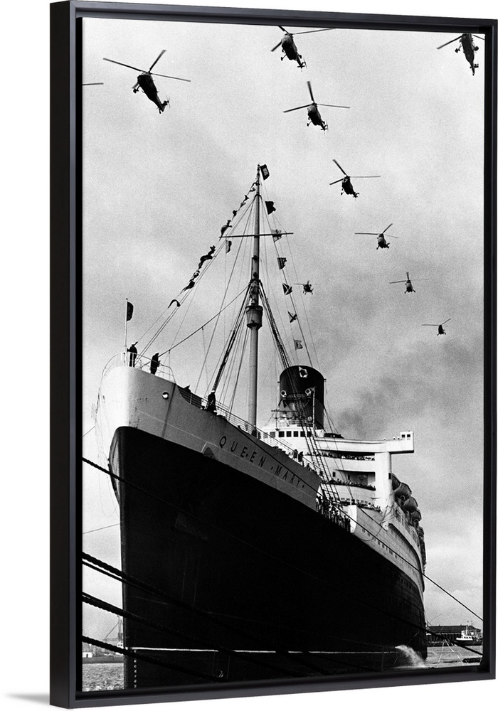 <p>Royal Navy helicopters fly in formation over the Cunard liner Queen Mary as she leaves Southampton on the last voyage of her career.</p>