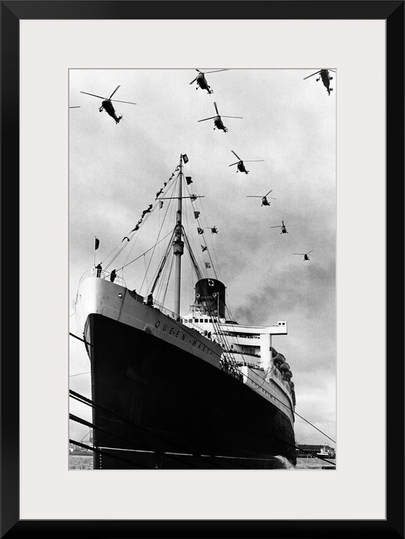 <p>Royal Navy helicopters fly in formation over the Cunard liner Queen Mary as she leaves Southampton on the last voyage of her career.</p>