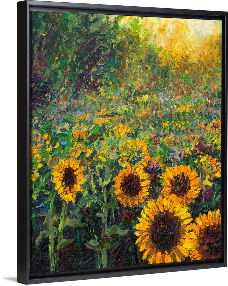 <p>Brightly colored contemporary artwork of a field of sunflowers.</p>