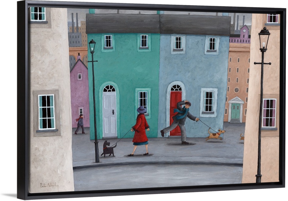<p>Contemporary painting of a town folk walking their dogs and saying hello.</p>