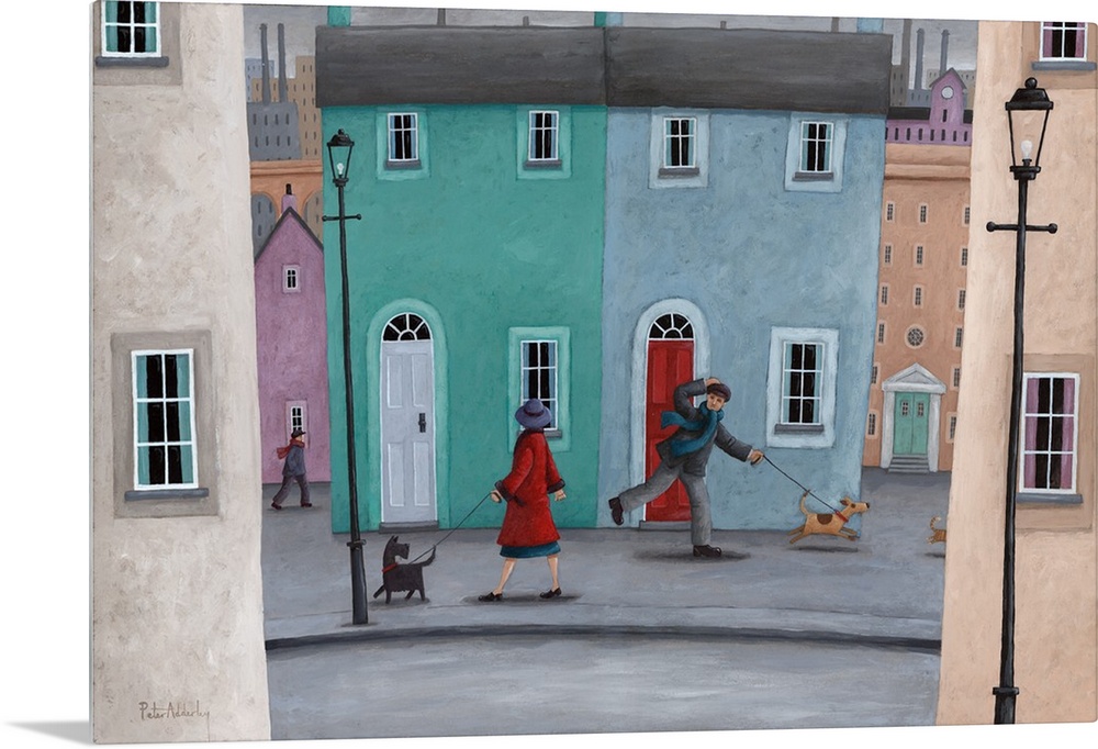 <p>Contemporary painting of a town folk walking their dogs and saying hello.</p>