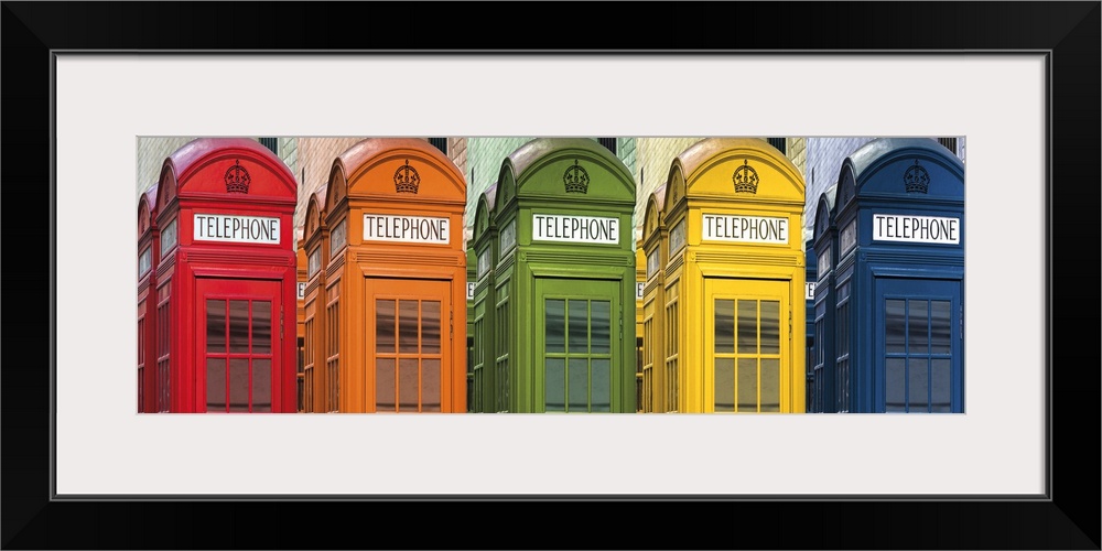 <p>A panoramic photo of a telephone booth in London, England, done in different primary colors.</p>