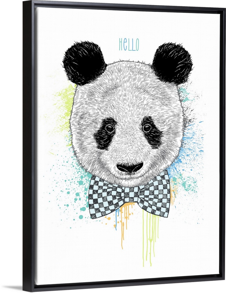 <p>A digital illustration of a panda with a bow tie against splashes of color and "Hello" above.</p>