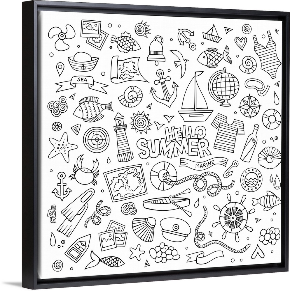 <p>A series of summer and beach-themed objects, such as boats and fish, surrounding the words "Hello Summer." Perfect for Coloring Canvas.</p>