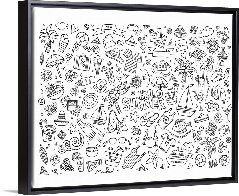 <p>A series of summer and beach-themed objects, such as boats and fish, surrounding the words "Hello Summer." Perfect for Coloring Canvas.</p>