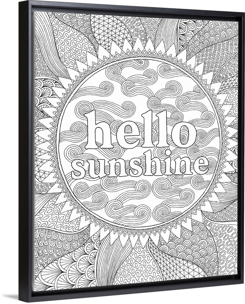 <p>Black and white line art with the phrase "Hello Sunshine" written inside an intricately designed sunflower.</p>