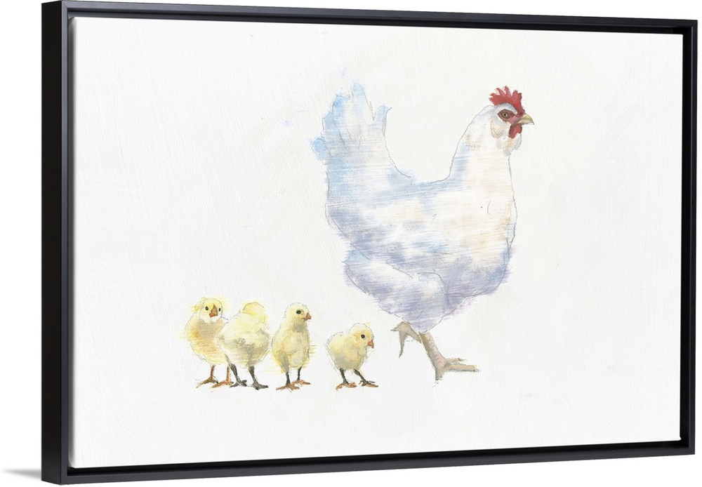 <p>A contemporary painting of a hen and chicks against a white background.</p>