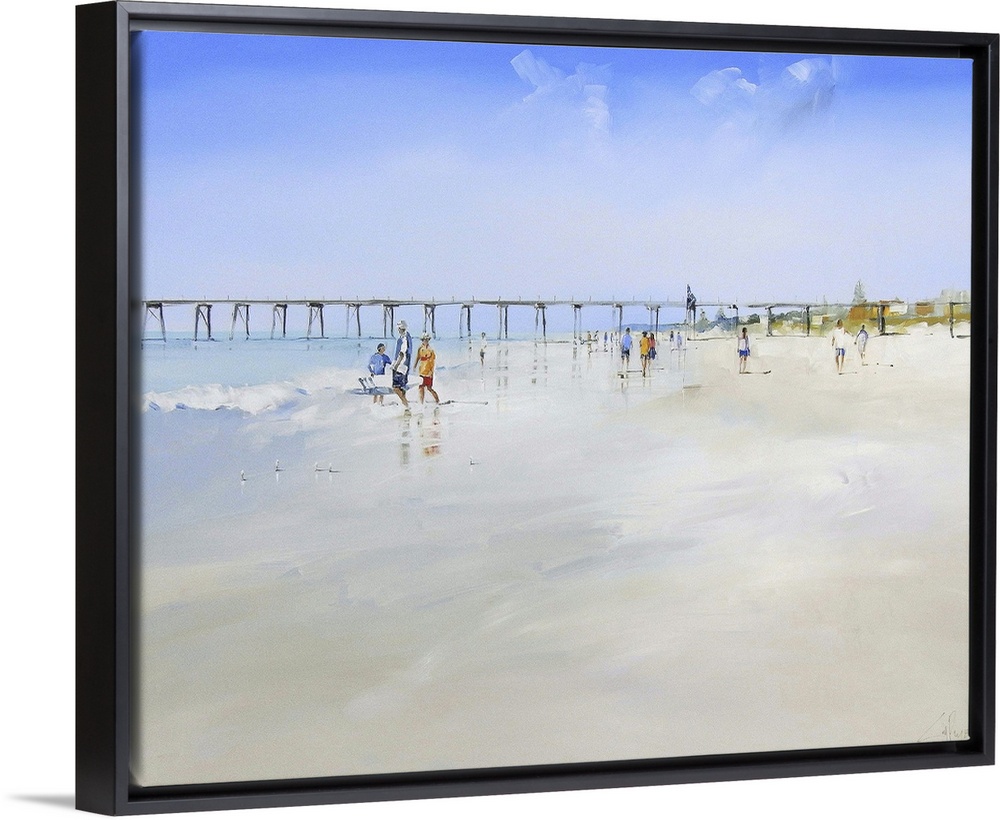 <p>Painting of people walking on a sandy beach with a pier in the distance.</p>