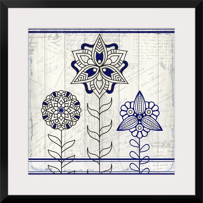 <p>A black and blue symmetric design of three flowers with a collage of handwritten postcards in the background.</p>